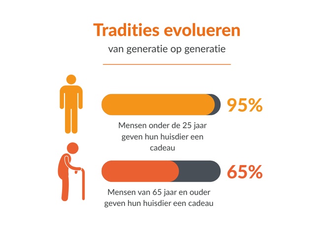 De aandacht die we aan onze huisdieren besteden, verschilt duidelijk per generatie. Jongeren, vooral mensen jonger dan 25 jaar, lijken bijzonder gehecht aan de traditie om hun huisdier een cadeau te geven: bijna 95% zegt dit te willen doen. Oudere generaties tonen daarentegen minder neiging, wat wellicht wijst op een andere kijk op de relatie tussen mens en dier. Deze bevinding — in combinatie met het feit dat slechts 68% van de 65-plussers van plan is hun huisdier een cadeau te geven — suggereert een evolutie in mentaliteit. Jongere generaties, die hun dieren vaker als volwaardige familieleden beschouwen, lijken hiermee te breken met oudere tradities.
