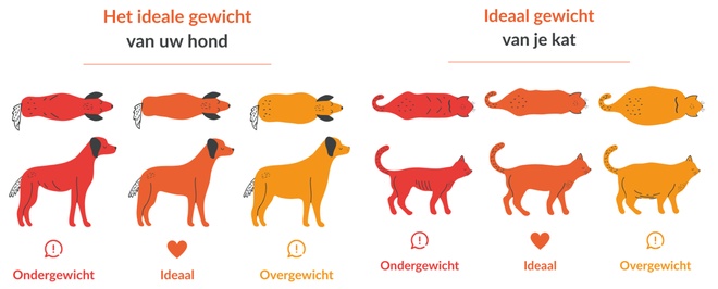 Een dier met overgewicht vertoont duidelijke fysieke tekenen, zoals het niet zichtbaar zijn van de ribben. Om te bepalen of een dier te zwaar is, volstaat het om te controleren of de ribben voelbaar zijn bij aanraking. Onze experts raden echter aan om toch een dierenarts te raadplegen om het optimale gewicht van je dier te bepalen. Sylvia Masson benadrukt ook dat “vooral een verandering in activiteitsniveau een waarschuwing moet zijn, of het nu gaat om een toename of een afname.” Tekenen zoals abnormale kortademigheid, terughoudendheid om fysieke inspanning te leveren of traagheid tijdens wandelingen kunnen wijzen op overgewicht, maar ook op andere gezondheidsproblemen. Het is daarom beter om advies te vragen aan een dierenarts.