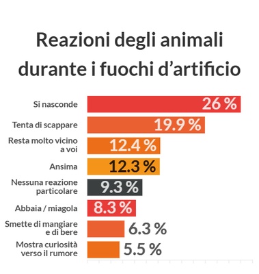 La nostra indagine rivela che il 26% degli animali si nasconde durante i fuochi d’artificio, mentre il 19,9% tenta di scappare.