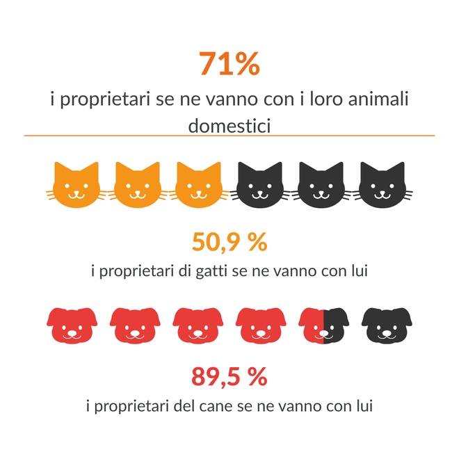 Tra gli intervistati, il 71,67% ha dichiarato di andare in vacanza con il proprio animale. Tuttavia, si nota una grande differenza a seconda del tipo di animale: l’89,5% dei proprietari di cani organizza le vacanze con il proprio cane, contro il 50,9% dei proprietari di gatti. I gatti, quindi, vengono lasciati più spesso a casa rispetto ai cani. Questo si spiega con il fatto che sono animali territoriali, facilmente disturbati da un nuovo ambiente.