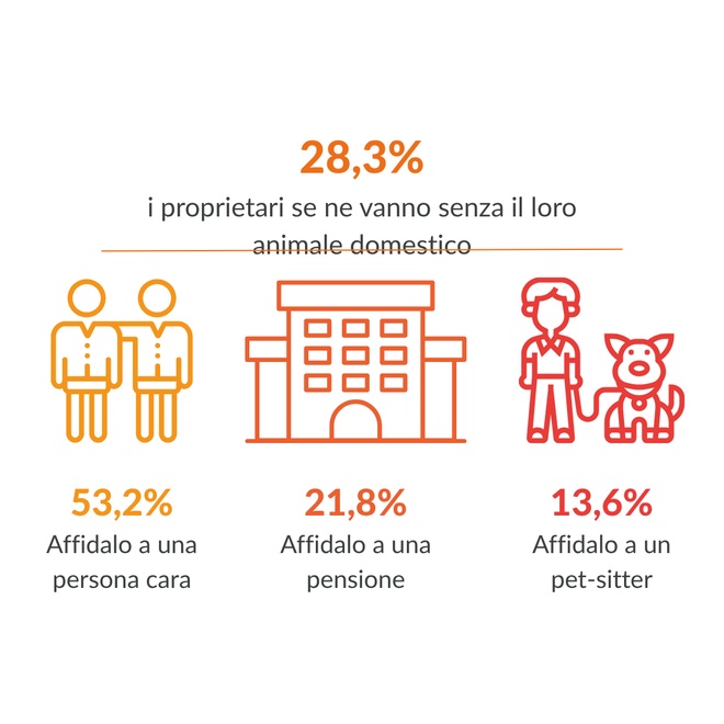 I proprietari scelgono diversi tipi di custodia: il 53,2% affida il proprio animale a una persona di fiducia (familiari o amici), il 21,8% preferisce una pensione e solo il 13,6% opta per il pet-sitting.
