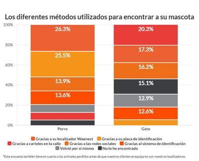Los perros se recuperan con mayor frecuencia gracias a su rastreador GPS (26,3%) o a su placa de identificación (25,5%). Los gatos también se encuentran con ayuda de sus localizadores (17,3%), pero asimismo mediante carteles en la calle (20,3%).