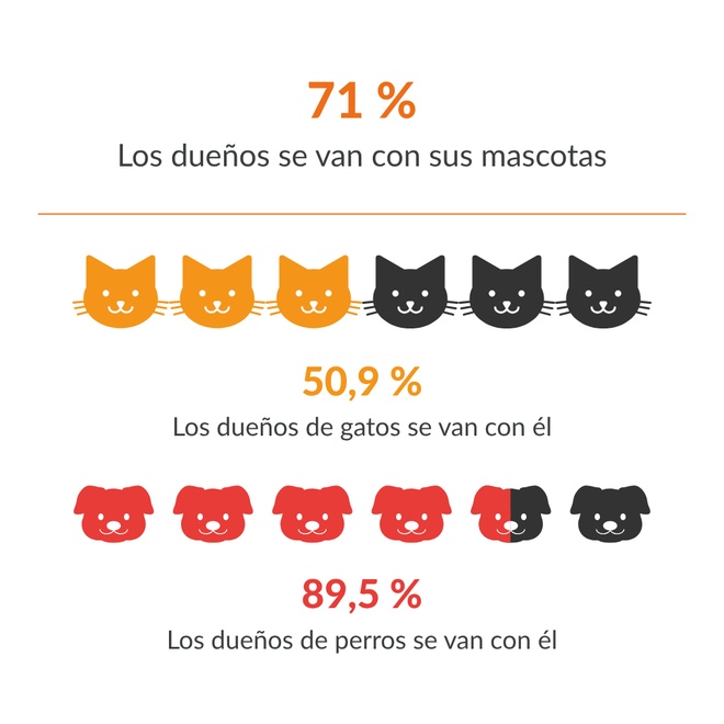 Entre los encuestados, el 71,67% declaró irse de vacaciones con su animal. Sin embargo, existe una gran diferencia según el tipo de mascota: el 89,5% de los dueños de perros viajan con ellos, frente al 50,9% de los dueños de gatos. Los gatos, por tanto, se dejan con mayor frecuencia en casa. Esto puede explicarse porque son animales territoriales que se alteran fácilmente en un entorno nuevo.